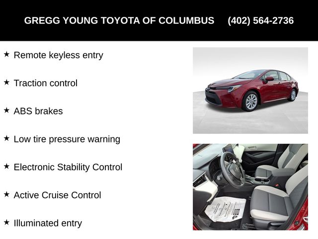Our 2026 Toyota Corolla Hybrid LE Sedan delivers fuel-efficient performance, advanced safety, and all-weather confidence wrapped in sleek Ruby Flare Pearl style. Powered by a 1.8 Liter 4 Cylinder and an Electric Motor offering a combined 138hp to an eCVT for peppy performance. Known for its impressive efficiency, this Front Wheel Drive sedan also sees nearly 51mpg in the city and nearly 44mpg on the highway. Sporty design cues help our Corolla Hybrid stand out with LED lighting, a bold black grille, and aggressive wheels.You've got room to move in our LE cabin, which is well-equipped with premium-fabric seats, a folding back row, a multifunction steering wheel, automatic climate control, power accessories, keyless access, a front center console, and a 4.2-inch driver display. An intelligent infotainment system helps you connect to your world by bundling an 8-inch touchscreen, WiFi compatibility, Bluetooth, wireless Apple CarPlay/Android Auto, voice command, and six-speaker audio.Many of Toyota's top safety features are on board for your peace of mind, starting with Proactive Driving Assist supported by automatic braking, forward collision warning, lane-departure alert, pedestrian detection, adaptive cruise control, a rearview camera, and more. Easy to own, our Corolla Hybrid LE is a fuel-efficient, fun machine! Save this Page and Call for Availability. We Know You Will Enjoy Your Gregg Young Toyota of Columbus Test Drive Towards Ownership!