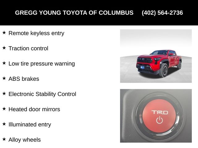 Built for the street but born for the trail, our 2026 Toyota Tacoma TRD Off-Road Double Cab 4X4 in Supersonic Red combines everyday drivability with off-road-tuned performance, rugged styling, and trail-ready features that elevate every adventure! Motivated by a TurboCharged 2.4 Liter i-FORCE MAX 4 Cylinder and an Electric Motor delivering a combined 326hp to an 8 Speed Automatic transmission for strength to spare. Also sporting an electronic locking rear differential, a TRD off-road suspension, and Bilstein shocks, the Four Wheel Drive truck returns nearly 24mpg on the highway. Our Tacoma's assertive design deserves attention with its LED lighting, wide-angle fog lamps, alloy wheels, front skid plates, a composite bed, a hitch receiver, and heated power mirrors with turn signals.Our TRD Off-Road cabin is on point when it comes to comfort. Highlights include supportive cloth seats, 10-way power for the driver, a leather-wrapped steering wheel, dual-zone automatic climate control, keyless access/ignition, and a power-sliding rear window. For adventure-friendly infotainment, you can turn to an 8-inch touchscreen, wireless charging, Android Auto, Apple CarPlay, Bluetooth, WiFi compatibility, Amazon Alexa compatibility, and a six-speaker sound system.Toyota's impressive array of safety measures helps you keep safe, including a rearview camera, lane-keeping assistance, adaptive cruise control, automatic braking, pedestrian detection, and more. Tough and talented, our Tacoma TRD Off-Road can take your driving to the next level! Save this Page and Call for Availability. We Know You Will Enjoy Your Test Drive Toward Ownership!