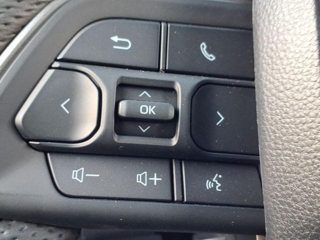- Leather-trimmed manual tilt/telescopic heated steering wheel with phone, audio, display/infotainment, and driver assist controls.