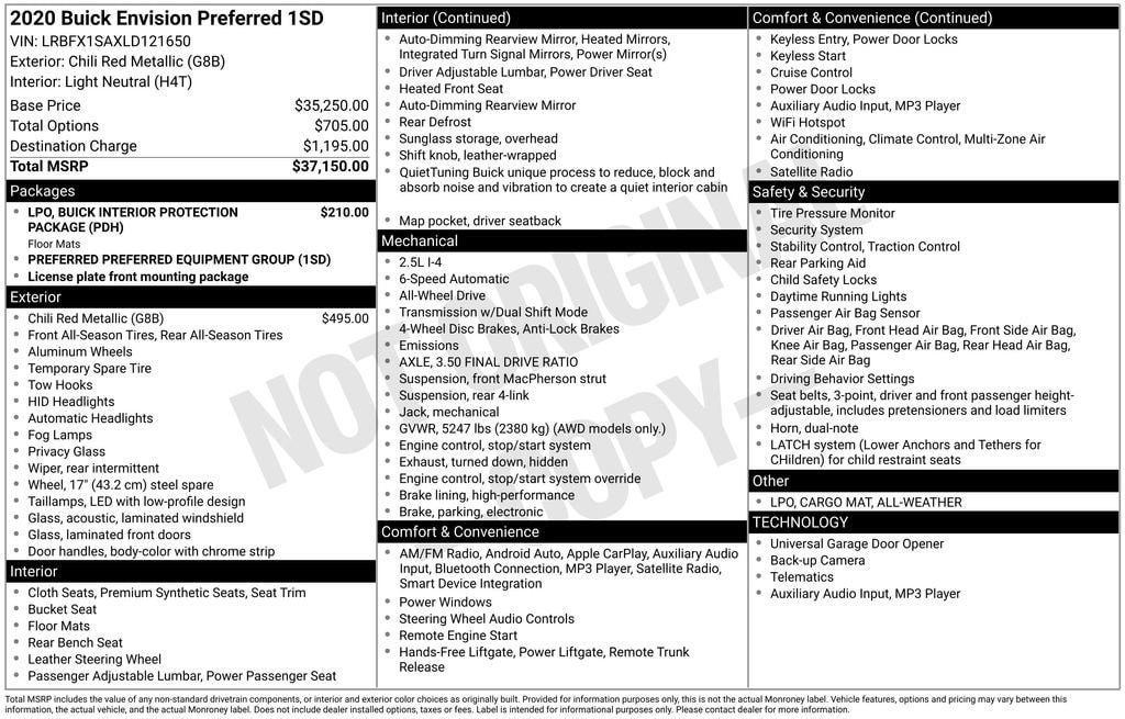 **2020**Buick**Envision**Preferred**AWD**Heated Seats**Power Liftgate**Bluetooth**Android Auto**Apple CarPlay**Relax in style when you drive our 2020 Buick Envision Preferred AWD, which looks especially refined and elegant in Chili Red Metallic! Powered by a 2.5 Liter 4 Cylinder that offers 197hp connected to a 6 Speed Automatic transmission for confident performance. You can also enjoy a quiet and capable ride in our All Wheel Drive SUV, which returns nearly 27mpg on the highway with a sculpted design. Our Envision has been crafted with care to show off HID headlamps, fog lamps, heated power mirrors, and a hands-free tailgate, all set off by bold 18-inch alloy wheels.Inside, our Preferred cabin has a tailored feel and provides ample room for up to five people. Heated power front seats, a leather-wrapped steering wheel, dual-zone climate control, and smart, easy-to-use technologies are all standard. With an 8-inch touchscreen and voice control, you're in charge of Android Auto, Apple CarPlay, Bluetooth, available WiFi, and a six-speaker audio system that delivers a high-end listening experience.A backup camera, rear parking sensors, stability/traction control, tire pressure monitoring, hill start assistance, ABS, and 10 airbags are just a few of the Buick safety features onboard for your peace of mind. Let our Envision Preferred soothe your senses when you get behind the wheel! Save this Page and Call for Availability. We Know You Will Enjoy Your Test Drive Towards Ownership!