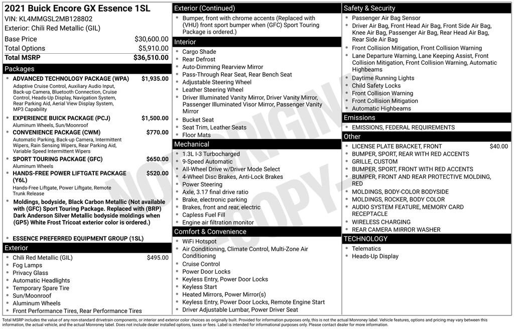 Drive our **Accident Free**2021**Buick**Encore GX**Essence**AWD**Buick Experience Package**Advanced Technology Package** and enjoy pure premium versatility plus a striking Chili Red Metallic design! Motivated by a TurboCharged 1.3 Liter EcoTec 3 Cylinder supplying 155hp connected to a CVT so you can move with confidence. As you go, this All Wheel Drive SUV also rewards you with nimble handling and the ability to score nearly 29mpg on the highway. The distinctive look of our Encore GX means you're ready to roll in style with LED lighting, fog lamps, heated power mirrors, roof rails, bold Carbon Black Metallic body-side moldings, and our package's panoramic sunroof and exclusive wheels.