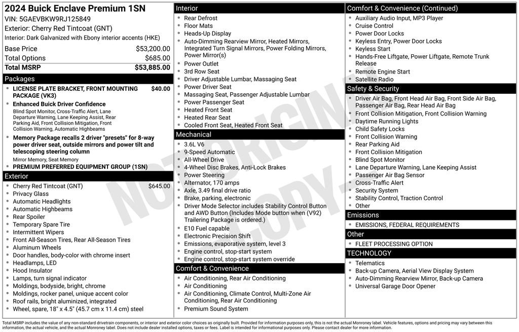 Elevate family driving in our **One Owner**Accident Free**2024**Buick**Enclave**Premium**AWD**Navigation**Heated Steering Wheel** that puts on a bold show of style in Cherry Red Tintcoat! Powered by a 3.6 Liter V6 offering 310hp to a 9 Speed Automatic transmission. This All Wheel Drive SUV also scores nearly 25mpg on the highway, and you can cruise with confidence and comfort thanks to its Premium Ride suspension. Premium details come into view with our Enclave's sophisticated sheet metal, LED lighting, heated power-folding mirrors, chrome accents, dual exhaust outlets, alloy wheels, roof rails, and a hands-free liftgate with logo projection.