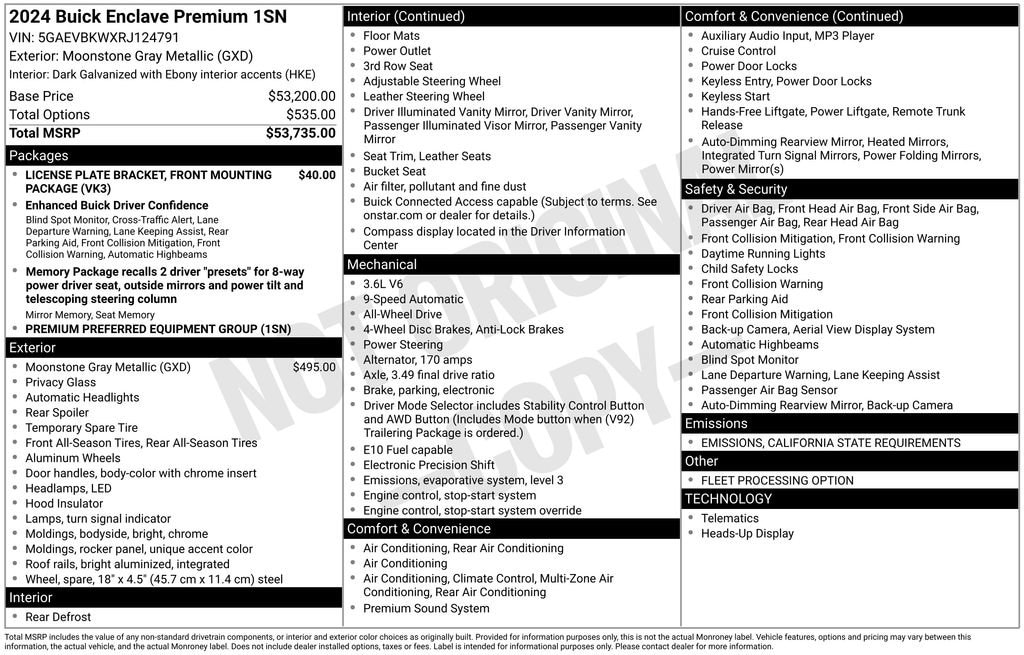 Elevate family driving in our **One Owner**Accident Free**2024**Buick**Enclave**Premium**AWD**Navigation**Heated and Cooled Leather Seats** that puts on a bold show of style in Moonstone Gray Metallic! Powered by a 3.6 Liter V6 offering 310hp to a 9 Speed Automatic transmission. This All Wheel Drive SUV also scores nearly 25mpg on the highway, and you can cruise with confidence and comfort thanks to its Premium Ride suspension. Premium details come into view with our Enclave's sophisticated sheet metal, LED lighting, heated power-folding mirrors, chrome accents, dual exhaust outlets, alloy wheels, roof rails, and a hands-free liftgate with logo projection.
