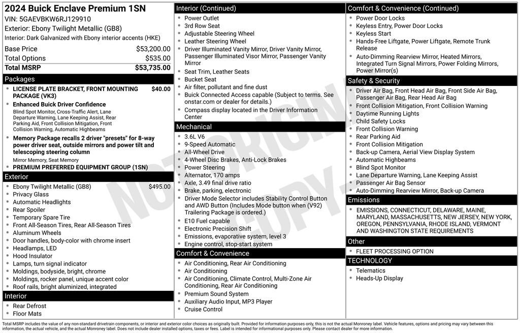Elevate family driving in our **One Owner**Accident Free**2024**Buick**Enclave**Premium**AWD**Navigation**Heated Steering Wheel** that puts on a bold show of style in Ebony Twilight Metallic! Powered by a 3.6 Liter V6 offering 310hp to a 9 Speed Automatic transmission. This All Wheel Drive SUV also scores nearly 25mpg on the highway, and you can cruise with confidence and comfort thanks to its Premium Ride suspension. Premium details come into view with our Enclave's sophisticated sheet metal, LED lighting, heated power-folding mirrors, chrome accents, dual exhaust outlets, alloy wheels, roof rails, and a hands-free liftgate with logo projection.Our Premium cabin lives up to its name with heated/ventilated leather power front and heated second-row seats, a power third row, a heated leather power steering wheel, tri-zone automatic climate control, keyless entry/ignition, a 120V power outlet, and remote start. Enjoy your favorite soundtrack with Bose audio, and get connected with an 8-inch driver display, an 8-inch touchscreen, full-color navigation, wireless charging, wireless Android Auto®/Apple CarPlay®, WiFi compatibility, and Bluetooth®.Buick encourages safer driving with smart features like a head-up display, HD surround vision, a digital rearview mirror, automatic braking, blind-spot monitoring, lane-keeping assistance, rear cross-traffic alert, and more. Built to be better, our Enclave Premium is ready for family travel! Save this Page and Call for Availability. We Know You Will Enjoy Your Test Drive Towards Ownership! We offer PRE-APPROVAL programs so call (515) 256-4010 to get started today! At Gregg Young Chevrolet... We'll Go The Extra Mile For You. We have an app for that! Download the Gregg Young Chevrolet application directly to your iPhone or Android.