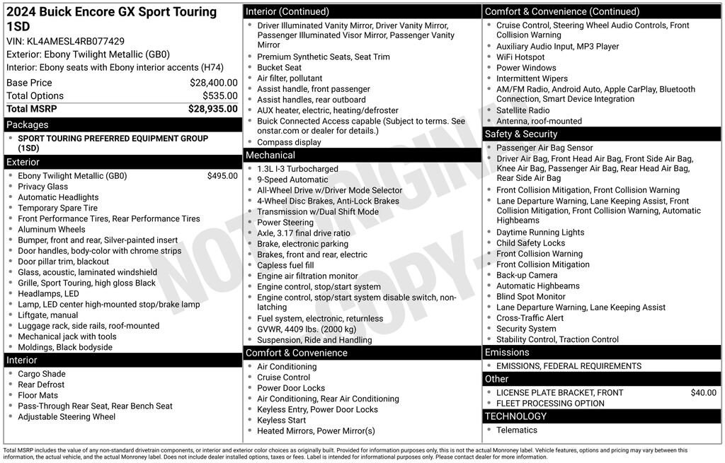 Our bold **One Owner**Accident Free**2024**Buick**Encore GX**Sport Touring**AWD**Bluetooth**Rear Camera** is refined and ready to go in Ebony Twilight Metallic! Motivated by a TurboCharged 1.3 Liter EcoTec 3 Cylinder providing 155hp to a 9 Speed Automatic transmission for confident acceleration. This All Wheel Drive SUV also sees nearly 28mpg on the highway with sharp handling for city traffic. Our Encore GX attracts attention, too, with a daring design that displays LED lighting, a gloss-black grille, matching alloy wheels, heated power mirrors, and roof rails.Distinctive details meet versatile comfort in our Sport Touring cabin. It's well-equipped for busy days with cloth-and-leatherette seats, a leather-wrapped steering wheel, single-zone climate control, cruise control, keyless access/ignition, and intelligent infotainment. An 8-inch driver display and an 11-inch touchscreen dominate the dash to deliver wireless Android Auto®/Apple CarPlay®, WiFi compatibility, Bluetooth®, voice control, and a six-speaker audio system with SiriusXM compatibility. You can enjoy clever cargo solutions, too!Buick helps you stay safer as you explore your world, providing automatic emergency braking, lane-keeping assistance, forward collision warning, blind-spot monitoring, an HD rearview camera, a following-distance indicator, and other intelligent features. Our Encore GX Sport Touring is a rewarding choice that's eager for adventures with you at the wheel! Save this Page and Call for Availability. We Know You Will Enjoy Your Test Drive Towards Ownership!We offer PRE-APPROVAL programs so call (515) 256-4010 to get started today! At Gregg Young Chevrolet... We'll Go The Extra Mile For You. We have an app for that! Download the Gregg Young Chevrolet application directly to your iPhone or Android.