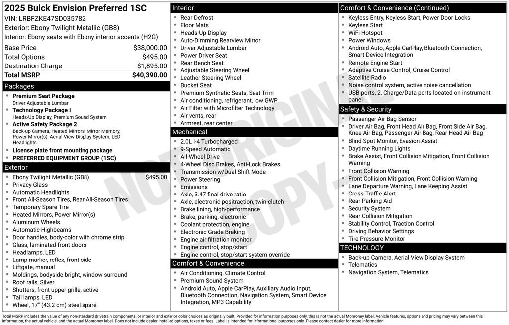 Our **2025**Buick**Envision**Preferred**AWD**Navigation**Leather Seats** invites you to enjoy an elevated ownership experience in Ebony Twilight Metallic! Powered by a TurboCharged 2.0 Liter 4 Cylinder supplying 228hp to a 9 Speed Automatic transmission for refined performance. You can also benefit from premium ride and handling in this All Wheel Drive SUV, which returns nearly 28mpg on the highway with a sleek and stylish exterior. It's a sophisticated look that helps turn heads with LED lighting, silver roof rails, bright bodyside molding, eye-catching 18-inch alloy wheels, and heated power mirrors with memory.Crafted to high standards, our Preferred cabin provides leatherette power front seats, a leather-wrapped steering wheel, automatic climate control, keyless access, and pushbutton ignition to enhance your journeys. An ultrawide 30-inch display graces the dashboard to help you access Google Built-in, wireless Apple CarPlay®/Android Auto®, WiFi compatibility, wireless charging, Bluetooth®, and a six-speaker audio system. Comfort, convenience, and technology define this dynamic interior!Buick helps you stay safely on the move with intelligent tech features like a head-up display, blind-spot steering assistance, lane-keeping assistance, HD surround vision, front/rear auto braking, adaptive cruise control, and more. You can start exploring new horizons today in our Envision Preferred! Save this Page and Call for Availability. We Know You Will Enjoy Your Test Drive Towards Ownership!