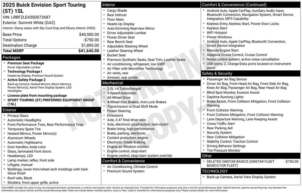 Our **One Owner**Accident Free**2025**Buick**Envision**Sport Touring**AWD**Navigation**Leather Seats** is a spirited choice engineered for today's drivers in Summit White! Powered by a TurboCharged 2.0 Liter 4 Cylinder offering 228hp paired with a 9 Speed Automatic transmission for dynamic capability on your command. This All Wheel Drive SUV also rewards you with nimble handling for successful city travel, and it returns nearly 29mpg on the highway. A premium presence, our Envision invites you to enjoy LED lighting, Dark Gloss body moldings, black roof rails, and eye-catching 20-inch alloy wheels.