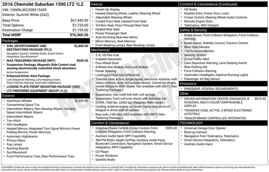 Eye-catching in Summit White, our top-of-the-line **2016**Chevrolet**Suburban**LTZ**4X4**Sun, Entertainment and Destination Package**Max Trailering Package** offers the power, capability, and versatility that your active family demands! Powered by a 5.3 Liter EcoTec V8 that delivers 355hp paired with a 6 Speed Automatic transmission to reward you with exceptional towing. This Four Wheel Drive SUV offers nearly 23mpg on the road and impressive acceleration whenever and wherever you need it. Capable of easily pulling big loads, this SUV rides like a luxury car with comfortable seating for your entire crew! Our Suburban LTZ has a commanding presence, a modern, aerodynamic profile highlighted by high-intensity headlamps, a sunroof, and a programmable hands-free liftgate.