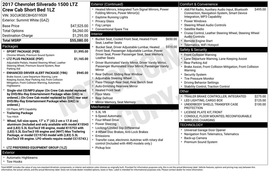 Engineered to be smart and strong, our **One Owner**Accident Free**2017**Chevrolet**Silverado 1500**LTZ**Crew Cab**4X4**Plus Package**Heated and Cooled Leather Seats** in Summit White, delivers the capability you require for work or play! Powered by a 5.3 Liter EcoTec3 V8 that offers 355hp connected to a 6 Speed Automatic transmission with tow/haul mode. This Four Wheel Drive truck shows off nearly 23mpg on the highway and has plenty of muscle to get your job done easily! The striking appearance of our Silverado 1500 LTZ looks top-notch with its chiseled physique, bold grille, chrome accents, prominent wheels, and high-strength steel bed.