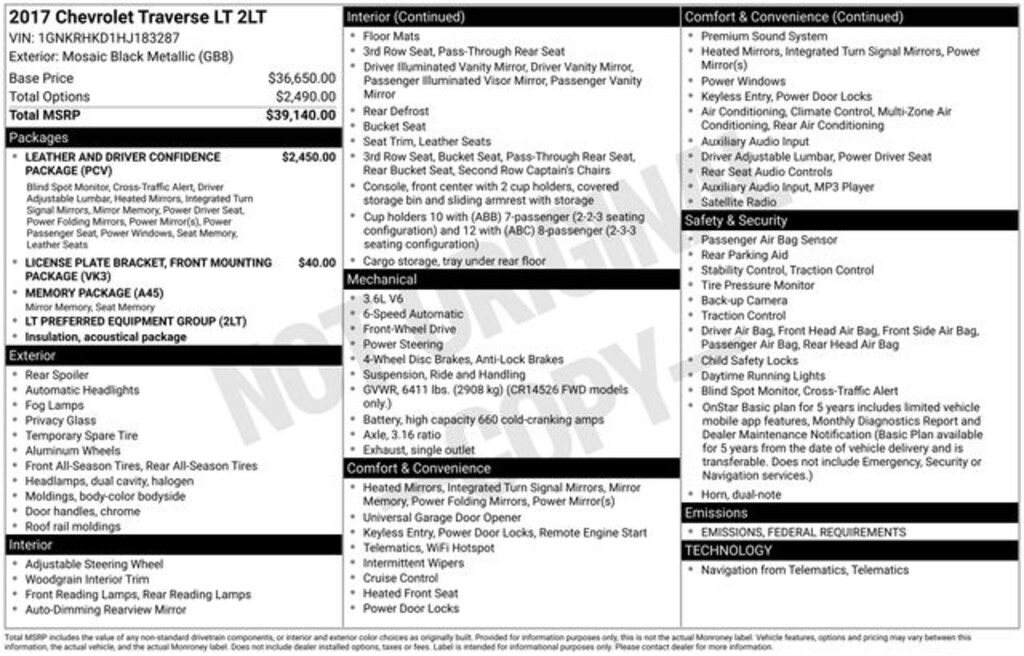 Our **2017**Chevrolet**Traverse**2LT**Heated Seats**Leather & Driver Confidence Package** is brought to you in Mosaic Black Metallic and should be at the top of your list! Powered by a 3.6 Liter V6 that delivers 288hp equipped with a 6 Speed Automatic transmission for easy passing maneuvers. Our Front Wheel Drive SUV can easily tow while offering a ride at the leading edge of comfort, security, and safety while achieving nearly 22mpg on the road! Notice our Traverse 2LT boasts classic good looks with a rear spoiler, fog lamps, a power liftgate, a sunroof, and great-looking wheels.