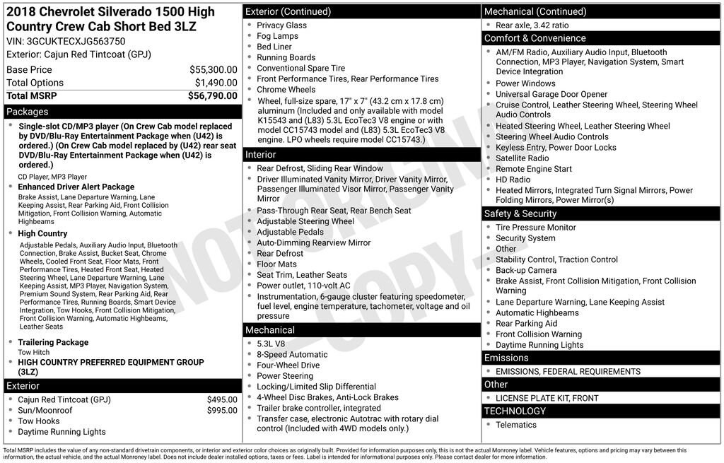 Our bold **One Owner**Accident Free**2018**Chevrolet**Silverado 1500**High Country**Crew Cab**4X4**Running Boards**Navigation** combines capability and elevated comfort in Cajun Red Tintcoat! Motivated by a 5.3 Liter EcoTec3 V8 supplying 355hp tethered to a robust 8 Speed Automatic transmission that's always ready to pull its weight and then some. Adventure is also in easy reach with this Four Wheel Drive truck that rewards you with composed handling and sees nearly 22mpg on the highway. Showing off a powerful personality, our Silverado sets the tone for style with HID headlights, LED fog lamps, 20-inch alloy wheels, a sunroof, and a spray-on bedliner with a molded-in Bowtie logo.Inside our High Country trim, you'll appreciate the quiet and thoughtfully designed cabin, which is outfitted with leather heated/ventilated power front seats, a leather heated steering wheel, dual-zone automatic climate control, and a Chevrolet MyLink infotainment system with an 8-inch touchscreen, full-color navigation, Bluetooth®, WiFi compatibility, and Bose audio. That's must-have equipment for modern-day truckers!Chevrolet takes care of you as you go with a backup camera, automatic braking, forward-collision warning, lane-keeping assistance, ABS, and advanced airbags. Whether conquering your work day or playing on the weekend, this Silverado 1500 High Country is a fantastic choice for your transportation needs! Save this Page and Call for Availability. We Know You Will Enjoy Your Test Drive Towards Ownership! We offer PRE-APPROVAL programs so call (515) 256-4010 to get started today! At Gregg Young Chevrolet... We'll Go The Extra Mile For You. We have an app for that! Download the Gregg Young Chevrolet application directly to your iPhone or Android.