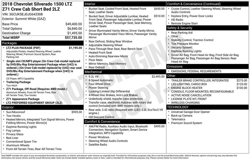 Engineered to be smart and strong, our **Accident Free**2018**Chevrolet**Silverado 1500**LTZ**Crew Cab**4X4**Sunroof**Heated and Cooled Leather Seats** in Summit White delivers all the capability you require for work or play! Powered by a 6.2 Liter EcoTec3 V8 generating 420hp paired with an 8 Speed Automatic transmission with tow/haul mode. This Four Wheel Drive truck executes flawlessly to provide up to 21mpg on the highway and plenty of muscle to get your job done easily! The striking appearance of our LTZ looks top-notch with its chiseled physique, bold grille, chrome accents, prominent wheels, and high-strength steel bed.Bask in the luxury and comfort of the well-designed LTZ cabin that greets you with a universal home remote, remote vehicle start, a rearview camera, heated leather seats, power accessories, and a driver information center. It's easy to stay in touch thanks to the Chevrolet MyLink radio with voice activation, an 8-inch color touchscreen, Bluetooth®, available satellite radio, Android Auto®/Apple CarPlay® capability, and OnStar with available WiFi.Our Chevrolet is built strong with the trailering package and received top safety scores with its high-strength steel, Stabilitrak, ABS, daytime running lamps, and plenty of airbags. You deserve this Silverado LTZ that can keep up with you, whether conquering your work day or playing hard on the weekend. Reward yourself! Save this Page and Call for Availability. We Know You Will Enjoy Your Test Drive Toward Ownership! We offer PRE-APPROVAL programs so call (402) 572-8080 to get started today! At Gregg Young Chevrolet... We'll Go The Extra Mile For You. We have an app for that! Download the Gregg Young Chevrolet application directly to your iPhone or Android.