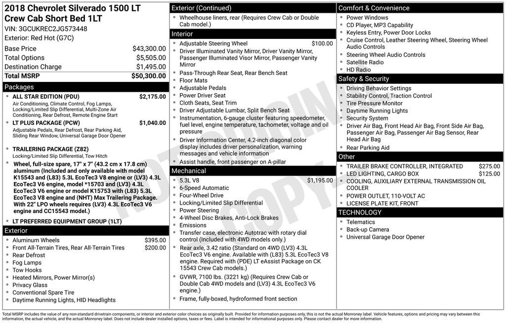 Our bold **One Owner**Accident Free**2018**Chevrolet**Silverado 1500**LT**Crew Cab**4X4**All Star Edition**Plus Package** in Red Hot gives you confidence in almost any situation! Powered by a 5.3 Liter EcoTec3 V8 offering 355hp tethered to a 6 Speed Automatic transmission with tow/haul mode. Get your job done with ease in this Four Wheel Drive truck that also rewards you with composed handling and scores nearly 22mpg on the highway with a functional yet stylish design that's enhanced by LED lighting, heated power mirrors, 17-inch alloy wheels, and an EZ Lift & Lower tailgate.