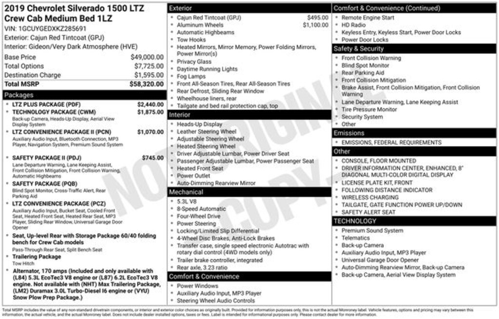 Our **One Owner**Accident Free**2019**Chevrolet**Silverado 1500**LTZ**Crew Cab**4X4**Heated and Cooled Leather Seats**Heated Steering Wheel** provides premium features inside and out with a powerful Cajun Red Tintcoat design! Motivated by a 5.3 Liter EcoTec3 V8 that offers 355hp paired to an 8 Speed Automatic transmission with tow/haul mode for easier pulling. This Four Wheel Drive truck also raises the bar for capability with a heavy-duty auto-locking rear differential and an advanced trailering system. It sees nearly 22mpg on the highway. Standing strong, our Silverado has a purposeful look with LED lighting, fog lamps, chrome accents, heated power-folding mirrors, bold alloy wheels, and an EZ-Lift tailgate.