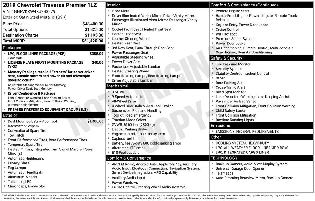 The right choice for any adventure, our **Accident Free**2019**Chevrolet**Traverse**Premier**AWD**Navigation**Sunroof** offered in amazing Satin Steel Metallic! Powered by a 3.6 Liter V6 that delivers 310hp connected to a 9 Speed Automatic transmission for easy passing. This All Wheel Drive SUV also scores nearly 25mpg on the highway with easy maneuverability in town and power for towing that toy on the weekends. Our Traverse has a premium look, too, with LED lighting, fog lamps, a hands-free liftgate, alloy wheels, a sunroof, dual exhaust outlets, and heated power mirrors with built-in turn signals.