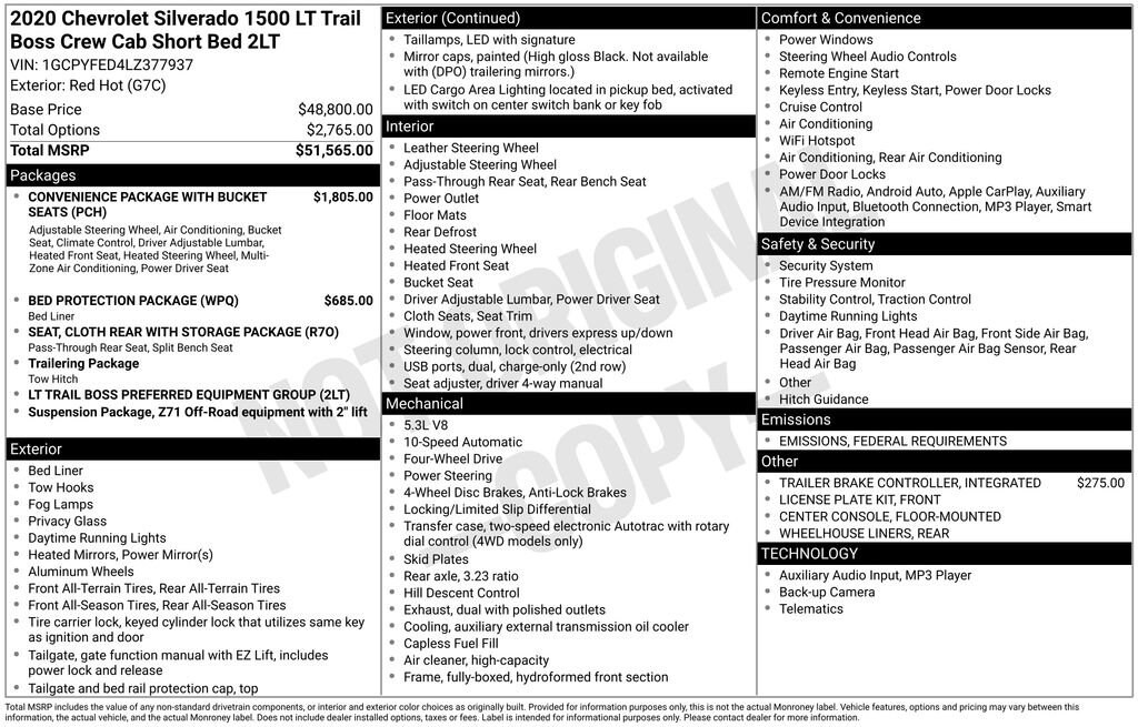Our **One Owner**Accident Free**2020**Chevrolet**Silverado 1500**LT Trail Boss**Crew Cab**4X4**Convenience Pack**Heated Steering Wheel** is a serious adventure machine that looks great in Red Hot! Powered by a 5.3 Liter EcoTec3 V8 that serves up 355hp paired to a 10 Speed Automatic transmission with tow/haul mode for enhanced capability! You can achieve nearly 22mpg on the highway with this Four Wheel Drive truck, which lets you ride like a boss thanks to a 2-inch factory lift kit, an AutoTrac two-speed transfer case, and a Z71 off-road suspension with Rancho monotube shocks. Heated mirrors, 18-inch alloy wheels, a spray-on bedliner, and LED lighting add a dash of style to our Silverado's rugged good looks.