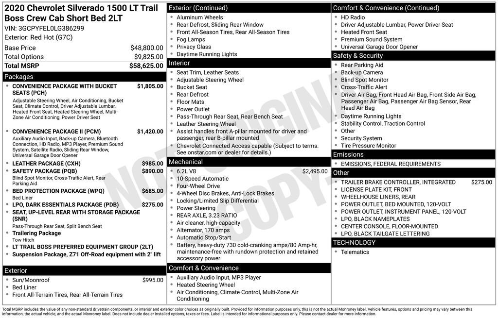 Our **One Owner**Accident Free**2020**Chevrolet**Silverado 1500**LT Trail Boss**Crew Cab**4X4**** is a serious adventure machine that also satisfies your need for comfort in Red Hot! Powered by a 6.2 Liter EcoTec3 V8 serving up 420hp paired to a 10 Speed Automatic transmission with a tow/haul mode. You can see nearly 20mpg on the highway with this Four Wheel Drive truck, plus it lets you ride like a boss thanks to a 2-inch factory lift kit, an AutoTrac two-speed transfer case, and a Z71 off-road suspension with Rancho monotube shocks. Heated mirrors, running boards, a tonneau cover, premium wheels, gloss-black details, a sunroof, and LED lighting bring a dash of style to our Silverado's rugged good looks.Take over the controls in our LT Trail Boss cabin, and you'll find supportive heated leather seats, a heated leather-wrapped steering wheel, single-zone semi-automatic climate control, remote start, keyless entry, cruise control, and power accessories. Our Silverado provides superior connectivity with an 8-inch touchscreen, Android Auto®, Apple CarPlay®, Bluetooth®, WiFi Compatibility, and a six-speaker audio system.A high-strength steel frame is the foundation for Chevrolet safety to support a rearview camera, hitch guidance, Stabilitrak stability/traction control, ABS, daytime running lamps, a rear-seat reminder, and plenty of airbags. Put our Silverado 1500 LT Trail Boss on your team and start winning today! Save this Page and Call for Availability. We Know You Will Enjoy Your Test Drive Towards Ownership! We offer PRE-APPROVAL programs so call (515) 256-4010 to get started today! At Gregg Young Chevrolet... We'll Go The Extra Mile For You. We have an app for that! Download the Gregg Young Chevrolet application directly to your iPhone or Android.