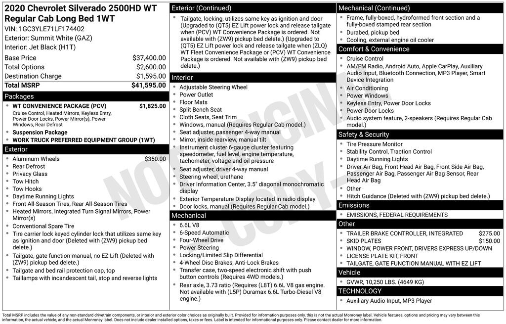 Work smarter, not harder, in our Accident Free, One Owner 2020 Chevrolet Silverado 2500 W/T Regular Cab 4X4 with the Convenience Package and a rugged Summit White finish! Powered by 6.6 Liter V8 that offers 401hp connected to a 6 Speed Automatic transmission for amazing capability. This Four Wheel Drive truck rewards you with large payload and towing capacities, and with our advanced trailering technologies, you'll still have exceptional confidence and control on every road. Dominate your day in our Silverado 2500, ready to serve you well with its aggressive stance, bold black grille, daytime running lights, and functional benefits like integrated steps for easy access to the cargo bed.