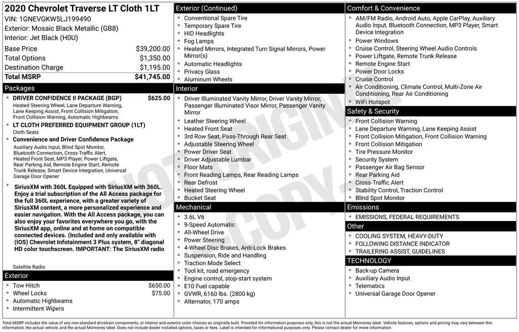 Our **Accident Free**2020**Chevrolet**Traverse**LT**AWD**Heated Seats**Driver Confidence II Package** moves forward with style and comfort in Mosaic Black Metallic! Powered by a 3.6 Liter V6 delivering 310hp connected to a 9 Speed Automatic transmission for confident capability. This All Wheel Drive SUV also scores nearly 25mpg on the highway, and it's a great choice for commuting, car-pooling, camping out, and more. Check out our bold Traverse for LED lighting, fog lamps, heated power mirrors, roof rails, deep-tinted glass, a power liftgate, and 18-inch alloy wheels.