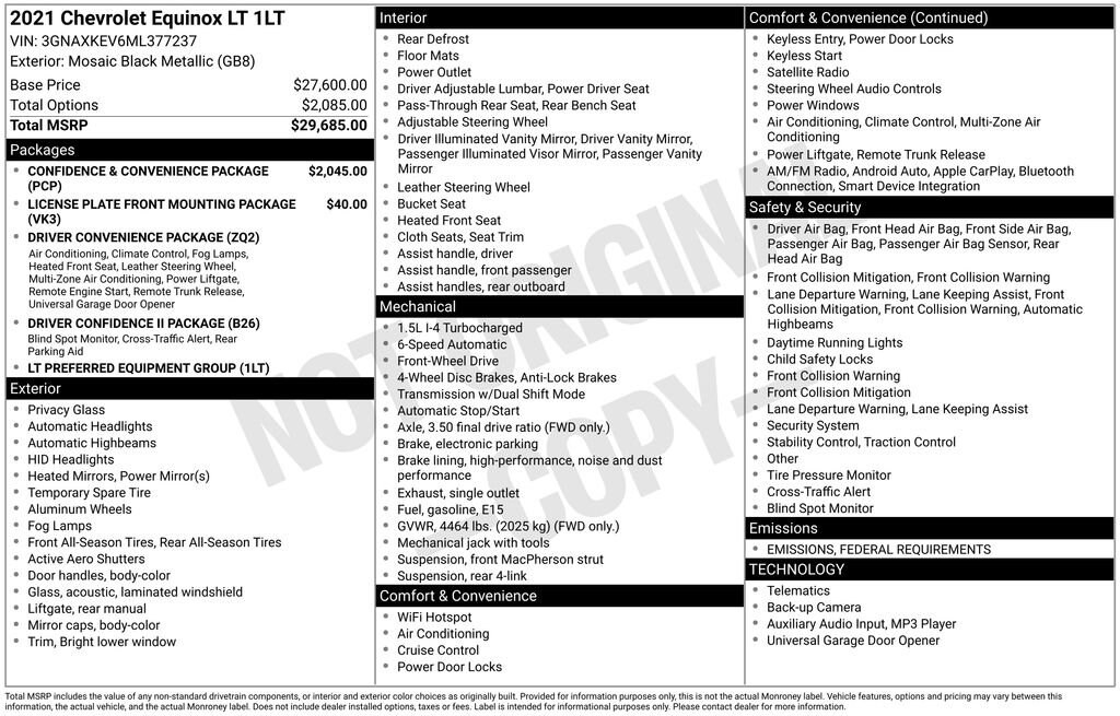 Filled with smart features, our **Certified**2021**Chevrolet**Equinox**LT**Confidence & Convenience Package**Heated Seats** in Mosaic Black Metallic is more than just a pretty face! Powered by a TurboCharged 1.5 Liter 4 Cylinder offering 170hp connected to a 6 Speed Automatic transmission for confident passing. This Front Wheel Drive SUV also rewards you with calm handling and the ability to see nearly 31mpg on the highway, and it's good-looking, too. Check out its sculpted lines set off by LED lighting, HID headlamps, alloy wheels, deep-tinted rear glass, and heated power mirrors.Our LT interior boasts comfortable premium-cloth heated front seats, eight-way power for the driver, a deluxe steering wheel, air conditioning, keyless entry/ignition, and tech goodies all around you. It all starts with a 7-inch touchscreen, a 4.2-inch driver display, Bluetooth®, WiFi compatibility, Android Auto®/Apple CarPlay®, voice command, and a six-speaker sound system with SiriusXM compatibility. And there's ample cargo space and lots of head/leg room to make everyone happy.For intelligent passenger protection, Chevrolet provides Safety Assist technology such as automatic braking, lane-keeping assistance, forward collision alert, and a following-distance indicator to complement a rearview camera, tire pressure monitoring, hill-start assistance, StabiliTrak, and more. Our Equinox LT helps you get around and get away from it all! Save this Page and Call for Availability. We Know You Will Enjoy Your Test Drive Towards Ownership! We offer PRE-APPROVAL programs so call (515) 256-4010 to get started today! At Gregg Young Chevrolet... We'll Go The Extra Mile For You. We have an app for that! Download the Gregg Young Chevrolet application directly to your iPhone or Android.