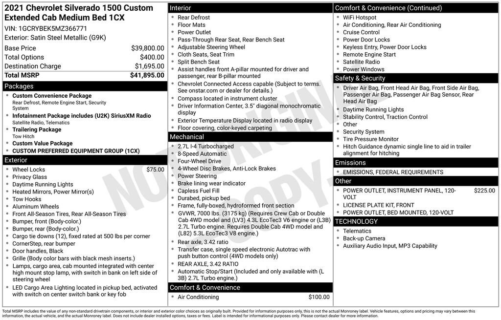 Our rugged **Certified**2021**Chevrolet**Silverado 1500**Custom**Double Cab**4X4**Apple CarPlay/Android Auto**Remote Starter** in Satin Steel Metallic is built to get the job done right! Powered by a 2.7L Turbo delivering 310hp paired with an 8 Speed Automatic transmission with tow/haul mode to maximize your pulling potential. This Four Wheel Drive truck also has a calm, responsive ride and returns nearly 22mpg on the highway. Standing tall, our Silverado shows fierce functionality with a bold grille, heated power mirrors, black recovery hooks, a CornerStep rear bumper, an EZ Lift & Lower tailgate, and terrific 20-inch alloy wheels.