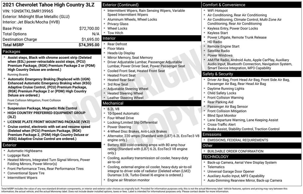 Big and bold, our **One Owner**Accident Free**2021**Chevrolet**Tahoe**High Country**4WD**Navigation**Heated Steering Wheel** is hard to ignore and easy to love in Midnight Blue Metallic! Powered by a 6.2 Liter V8 delivering 420hp paired to a 10 Speed Automatic transmission for robust performance. This Four Wheel Drive SUV helps keep things comfortable with Magnetic Ride Control, and it returns nearly 19mpg cruising on the highway. Our tough Tahoe shows off its full-sized presence with bronze grille accents, 22-inch wheels, and LED lighting to go with functional benefits like a hands-free liftgate to help pack for your next adventure.