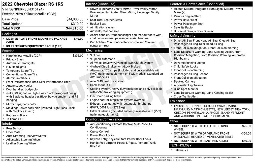 Start driving our **Certified**2022**Chevrolet**Blazer**RS**AWD**Heated Seats**Heated Steering Wheel** in Nitro Yellow Metallic, and prepare for stares! Motivated by a 3.6 Liter V6 providing 308hp matched to a 9 Speed Automatic transmission for spirited performance. This All Wheel Drive SUV is also easy to maneuver and fun to pilot, plus it returns nearly 26mpg. A stylish design is another benefit of our Blazer, which is ready to roll with an exclusive RS grille set off by LED lighting, HID headlamps, a hands-free liftgate, 20-inch alloy wheels, heated mirrors, and dual exhaust outlets for a fantastic finish.Our sporty and versatile RS cabin treats you right with heated leather power front seats, a heated leather-wrapped steering wheel, dual-zone automatic climate control, keyless access, pushbutton ignition, and remote start. Full-color navigation makes way-finding easy, and you're well connected with an 8-inch driver information display, an 8-inch touchscreen, wireless Android Auto/Apple CarPlay, Bluetooth, WiFi compatibility, and a six-speaker audio system.Chevrolet shows its focus on first-class safety with intelligent technology such as a backup camera, blind-zone alert, automatic braking, lane-keeping assistance, rear cross-traffic alert, rear parking sensors, forward collision warning, and a rear-seat reminder. Our Blazer RS blends all that and more to bring you better driving each day. Save this Page and Call for Availability. We Know You Will Enjoy Your Test Drive Towards Ownership!