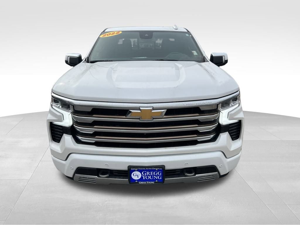 Our **Accident Free**2022**Chevrolet**Silverado 1500**High Country**Crew Cab**4X4**Premium Package**Sunroof** is comfortable and commanding in Iridescent Pearl Tricoat! Motivated by a 5.3 Liter EcoTec3 V8 that offers 355hp to a 10 Speed Automatic transmission so you're well-prepared for what the day may bring. This Four Wheel Drive truck also maximizes its potential with a high-capacity suspension, and it achieves nearly 20mpg on the highway. A proud presence, our Silverado provides LED lighting, cargo-bed lamps, dual exhaust outlets, chrome assist steps, a Chevytec spray-on bed liner, chrome recovery hooks, a power tailgate, and our package for a power sunroof and 22-inch alloy wheels.