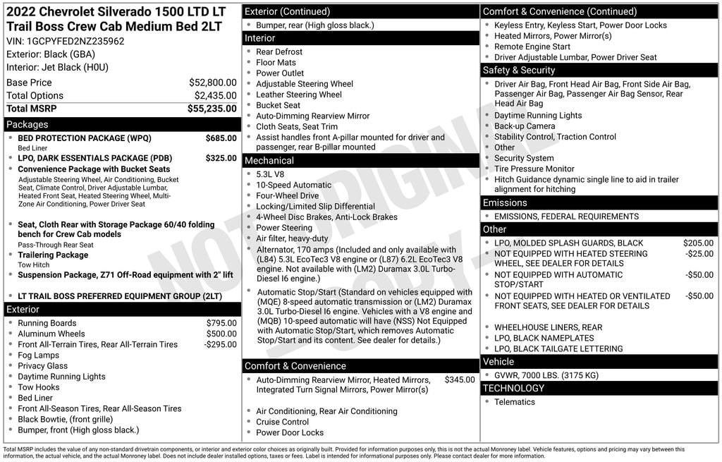 Our rugged **Certified**Accident Free**2022**Chevrolet**Silverado 1500 LTD**LT Trail Boss**Crew Cab**4X4**Convenience Package**Spray-on Bedliner** in Black is ready for the rough stuff! Powered by a 5.3 Liter V8 providing 355hp matched to a 10 Speed Automatic transmission for plenty of muscle. This Four Wheel Drive truck also rides high with a two-inch lift kit, Z71 off-road suspension, hill descent control, and automatic locking rear differential, and it scores nearly 19mpg on the highway. Our Silverado sets you up in style, too, with a black Bowtie emblem on the grille, plus LED lighting, fog lamps, red recovery hooks, gloss-black alloy wheels, skid plates, power-sliding rear window, and dual exhaust outlets.You can then explore your world with ease from the comfort of our LT Trail Boss cabin. It has a smart layout with impressive heated seats, 10-way power for the driver, a heated leather-wrapped steering wheel, dual-zone automatic climate control, keyless access/ignition, and remote start. Connecting is simple with an 8-inch touchscreen, Android Auto®/Apple CarPlay®, Bluetooth®, wireless phone projection, WiFi compatibility, USB ports, and Bose audio. This is a superior interior you'll love!Chevrolet safeguards your travels with intelligent features such as an HD backup camera, Stabilitrak stability/traction control, ABS, tire-pressure monitoring, Teen Driver, and dual-stage frontal airbags. All that and more makes our Silverado 1500 LTD LT Trail Boss a powerful choice for people just like you! Save this Page and Call for Availability. We Know You Will Enjoy Your Test Drive Towards Ownership!