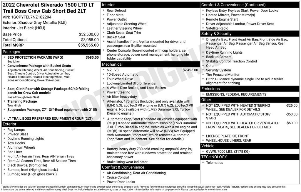 Our **2022**Chevrolet**Silverado 1500 LTD**LT Trail Boss**Crew Cab**4X4**Convenience Package**Heated Steering Wheel** blends bold capability and style in Shadow Gray Metallic! Powered by a 6.2 Liter EcoTec V8 offering 420hp to a 10 Speed Automatic transmission for trail-taming strength. This Four Wheel Drive truck raises the bar with a 2-inch lift and Z71 off-road suspension, and it scores nearly 19mpg on the highway. You'll even look like a Boss since our Silverado shows high-gloss black wheels, skid plates, LED lighting, fog lamps, red recovery hooks, a spray-on Bedliner, and our package for a trailer-brake controller and hitch guidance to complement the standard trailer hitch.Ready to rule, our LT Trail Boss cabin comes with heated cloth front seats, 10-way power for the driver, a heated leather-wrapped steering wheel, dual-zone automatic climate control, cruise control, keyless access/ignition, remote start, and our package for a rear power window and universal home remote. Our Chevrolet infotainment technology includes a 12.3-inch driver display, a 13.4-inch touchscreen, Google Built-in, WiFi compatibility, wireless Android Auto/Apple CarPlay, Bluetooth, and six-speaker audio.Chevrolet inspires confidence as you keep moving, thanks to intelligent safety features such as an HD backup camera, automatic braking, lane-keeping assistance, forward collision warning, and more. Our Silverado LTD LT Trail Boss is ready to write your next adventure story! Save this Page and Call for Availability. We Know You Will Enjoy Your Test Drive Towards Ownership! We offer PRE-APPROVAL programs so call (515) 256-4010 to get started today! At Gregg Young Chevrolet... We'll Go The Extra Mile For You. We have an app for that! Download the Gregg Young Chevrolet application directly to your iPhone or Android.