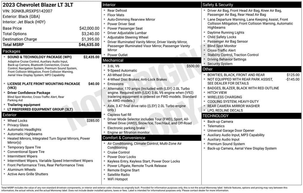 Our dynamic **Accident Free**2023**Chevrolet**Blazer**RS**AWD**Redline Edition**Sound & Technology Package** has a sporty spirit that shines through in Black! Powered by a 3.6 Liter V6 that delivers 308hp tethered to a 9 Speed Automatic transmission for a rewarding driving experience. You can confidently cruise the road seeing nearly 26mpg on the highway, and this All Wheel Drive SUV has quick reflexes and matching acceleration for urban action. Contoured curves add further flair to our Blazer's design, which features LED lighting, 20-inch alloy wheels, black Bowtie emblems, a hands-free liftgate, and a signature RS grille.