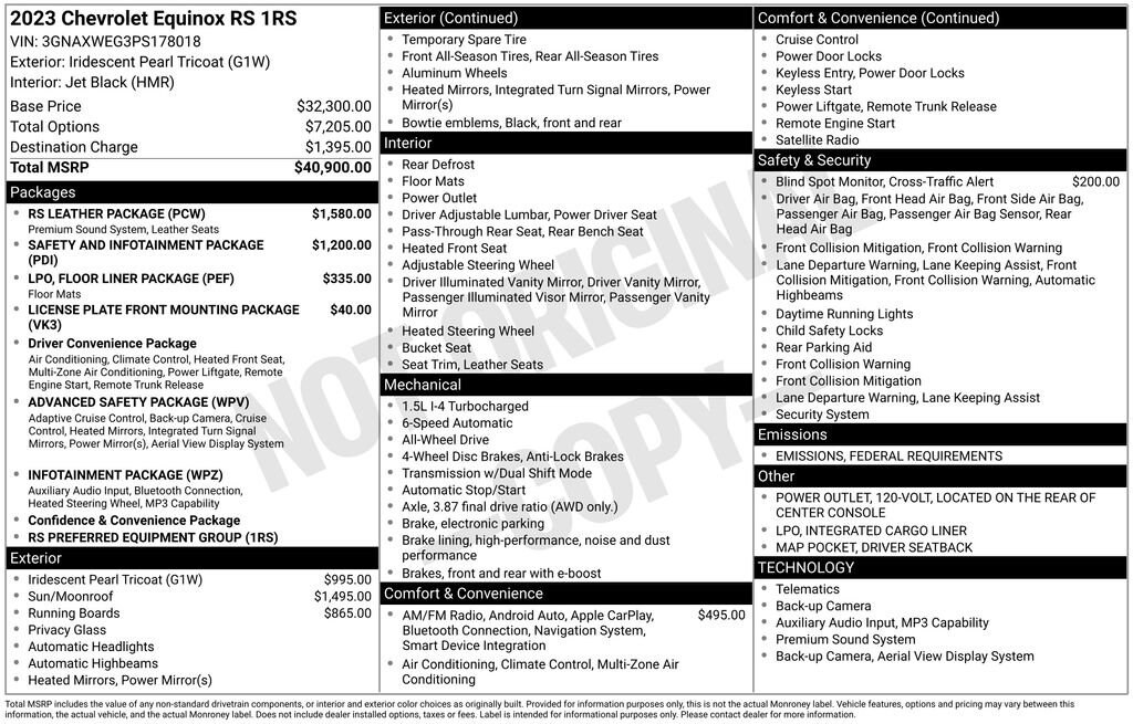 Prepare to be impressed with our **One Owner**Accident Free**2023**Chevrolet**Equinox**RS**AWD**Sunroof**Heated Steering Wheel** which is here to help show off your sporty side in Iridescent Pearl Tricoat! Motivated by a TurboCharged 1.5 Liter 4 Cylinder that generates 175hp connected to a 6 Speed Automatic transmission for versatile performance. This All Wheel Drive SUV also features responsive handling, and it returns nearly 30mpg on the highway with head-turning good looks. Our Equinox's inspired design cues include LED lighting, black Bowtie emblems, 19-inch alloy wheels, a power programmable liftgate, roof rails, and heated power mirrors.