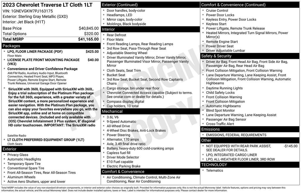 Families love our **One Owner**Accident Free**2023**Chevrolet**Traverse**LT**AWD**Heated Seats**Apple CarPlay/Android Auto** for its rewarding capability and upscale Sterling Gray Metallic appearance! Motivated by a 3.6 Liter V6 supplying 310hp connected to a 9 Speed Automatic transmission that's tuned to take on busy days. This All Wheel Drive SUV also sees nearly 25mpg on the highway with a refined exterior design. Our Traverse is a sleek head-turner with LED lighting, roof rails, bright dual-exhaust outlets, 18-inch alloy wheels, and heated power mirrors with built-in turn signals.Our LT Cloth cabin provides comfortable accommodation for seven with premium cloth seats, heated front seats with eight-way power for the driver, a leather-wrapped steering wheel, tri-zone automatic climate control, cruise control, keyless access/ignition, and superior connectivity. Top Traverse technologies include a 7-inch touchscreen, WiFi compatibility, wireless Apple CarPlay/Android Auto, Bluetooth, voice recognition, wireless charging, and six-speaker audio.You and your loved ones can travel confidently, knowing Chevrolet has your back with a rearview camera, automatic emergency braking, lane-keeping assistance, forward collision warning, blind-spot monitoring, rear parking sensors, pedestrian detection, StabiliTrak stability/traction control, and more! Our Traverse LT Cloth raises the bar for you and your family with fantastic benefits! Save this Page and Call for Availability. We Know You Will Enjoy Your Test Drive Towards Ownership!