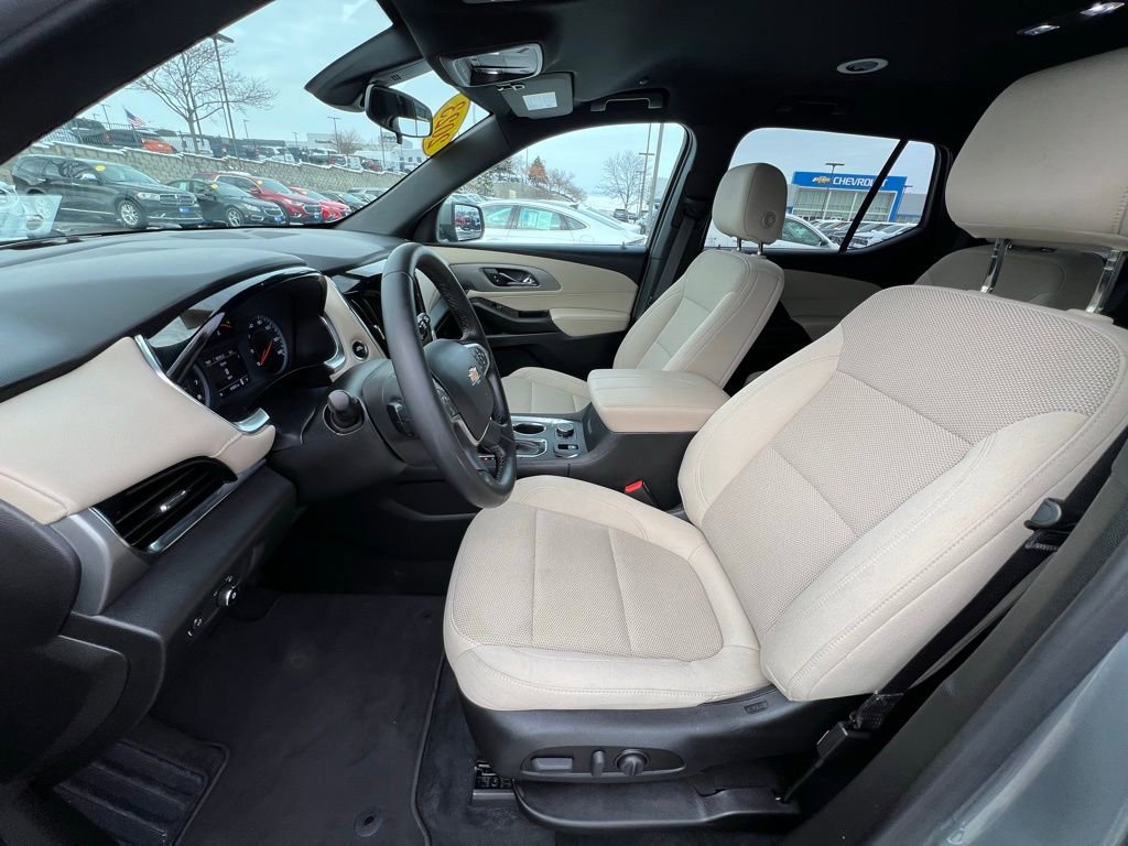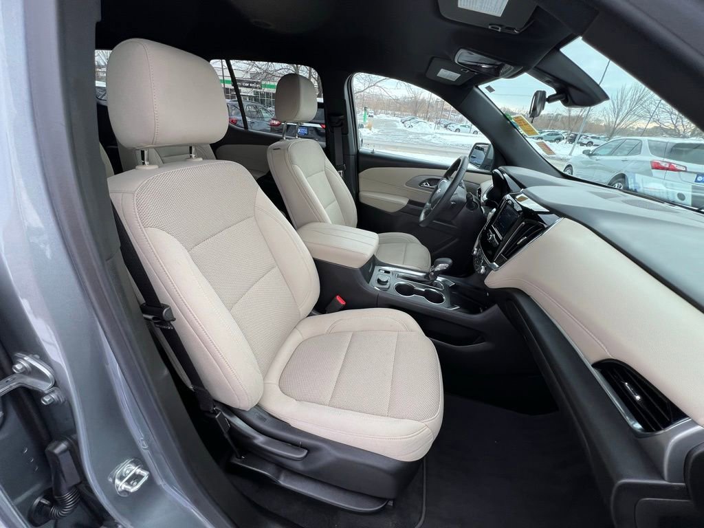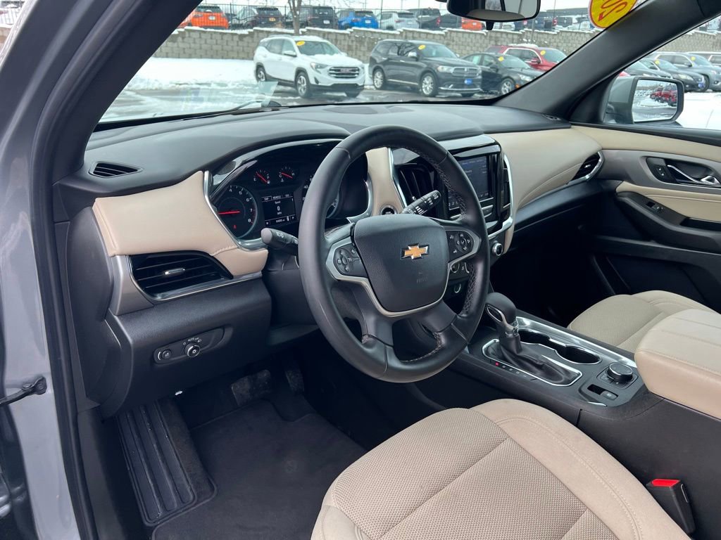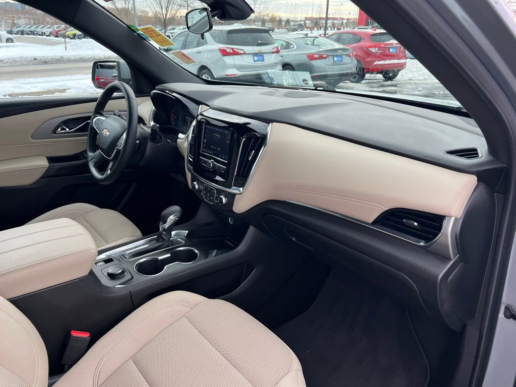 Our LT Cloth cabin provides comfortable accommodation for seven with premium cloth seats, eight-way power for the driver, a leather-wrapped steering wheel, tri-zone automatic climate control, cruise control, keyless access/ignition, and superior connectivity. Top Traverse technologies include a 7-inch touchscreen, WiFi compatibility, wireless Apple CarPlay®/Android Auto®, Bluetooth®, voice recognition, wireless charging, and six-speaker audio.