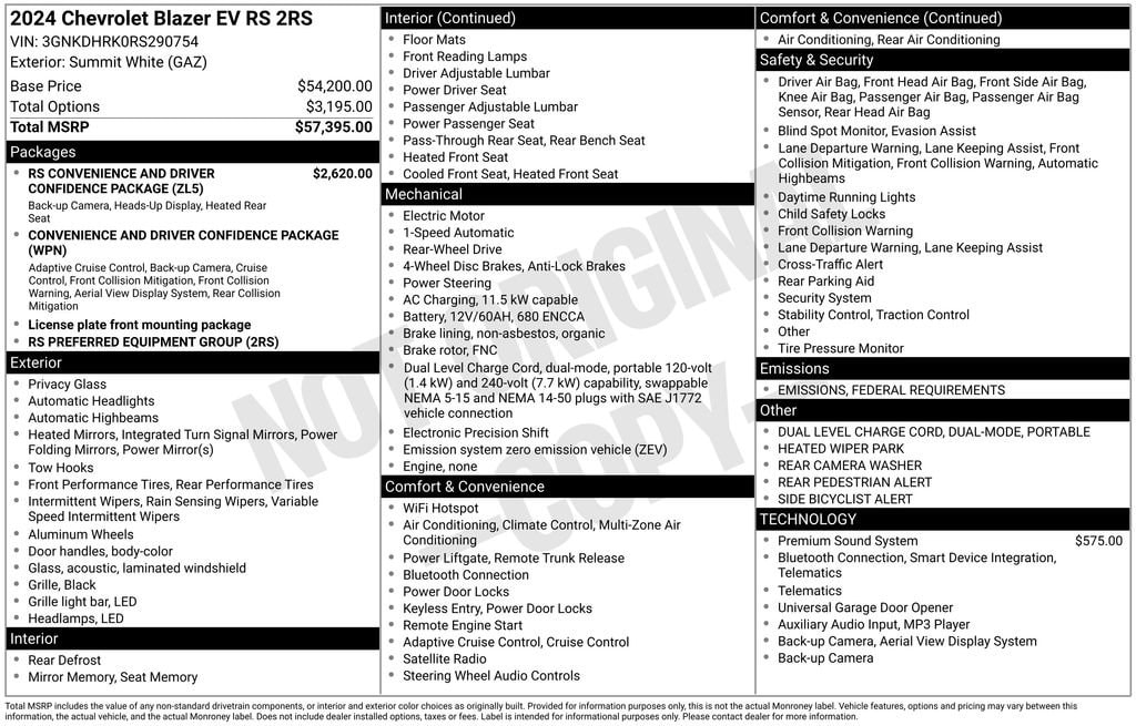 Our bold **One Owner**Accident Free**2024**Chevrolet**Blazer EV**RS**Convenience & Driver Confidence Package**Navigation** is engineered for electrified excitement in Summit White! Motivated by an Electric Motor serving up 340hp to a Single Speed Automatic transmission for high-performance efficiency. This Rear Wheel Drive SUV moves out with aggressive acceleration and offers an EV range of nearly 324 miles with its 85kWh battery pack. Sleek and dramatic, our Blazer EV boasts LED lighting, gloss-black roof rails, matching accents, 21-inch alloy wheels, a hands-free liftgate, a front light bar, and multifunction mirrors.Our RS cabin has a smart and roomy layout with heated/ventilated suede/Evotex power front seats, our Convenience & Confidence Pack's heated rear seats, a heated-wrapped sport steering wheel, dual-zone automatic climate control, keyless access, remote start, and remote start. A digital dashboard brings high-tech benefits like a 17.7-inch touchscreen, an 11-inch driver display, WiFi compatibility, Google Built-in, Bluetooth®, multiple USB-C ports, and six-speaker audio.More Chevrolet technology from our Convenience & Driver Confidence Pack adds a head-up display, digital rearview mirror, adaptive cruise control, enhanced front/rear automatic braking, and HD surround vision to active blind-spot assistance, forward collision warning, lane-keeping assistance, and more. Plug in our Blazer EV RS, and put yourself in the driver's seat! Save this Page and Call for Availability. We Know You Will Enjoy Your Test Drive Towards Ownership! We offer PRE-APPROVAL programs so call (515) 256-4010 to get started today! At Gregg Young Chevrolet... We'll Go The Extra Mile For You. We have an app for that! Download the Gregg Young Chevrolet application directly to your iPhone or Android.