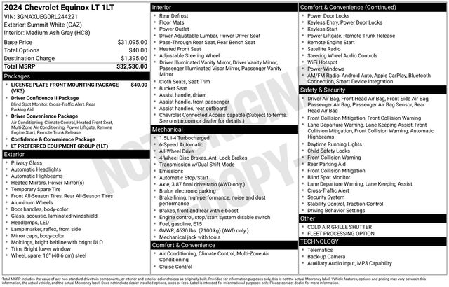 Our **One Owner**Accident Free**2024**Chevrolet**Equinox**LT**AWD**Heated Seats**Bluetooth** is crafted for comfortable journeys with a stylish Summit White design! Motivated by a TurboCharged 1.5 Liter 4 Cylinder generating 175hp matched to a 6 Speed Automatic transmission for adventure-friendly performance. This All Wheel Drive SUV also scores nearly 30mpg on the highway with agile handling. Have a close look at our Equinox to appreciate its appealing exterior with LED headlamps/daytime running lights, a power liftgate, bold alloy wheels, bright beltline moldings, and heated power mirrors.