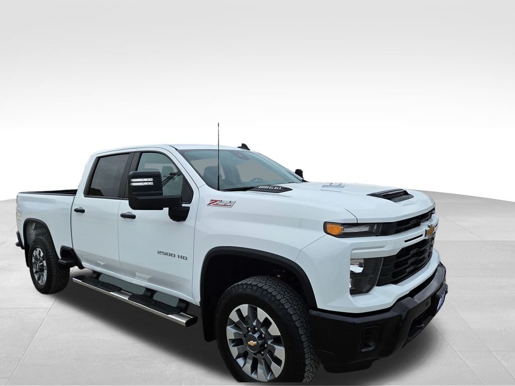 Our **One Owner**Accident Free**2025**Chevrolet**Silverado 2500**Custom**Crew Cab**4X4**Apple CarPlay/Android Auto**Remote Starter** is ready to rise to your next challenge in Summit White! Powered by a 6.6 Liter V8 generating 401hp for a 10 Speed Allison Automatic transmission tuned for tough jobs. This Four Wheel Drive truck is also easy to handle with the help of a 2-speed transfer case and an auto-locking rear differential. Radiating assertive confidence, our Silverado boasts 20-inch alloy wheels, black recovery hooks, power trailering mirrors, cargo-bed lighting, a trailer hitch, and a locking tailgate.