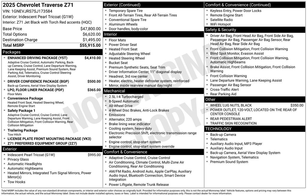 Prepare to shine with our **One Owner**Accident Free**2025**Chevrolet**Traverse**Z71**AWD**Navigation**Heated Seats** that is ready to take a different road forward in Iridescent Pearl Tricoat! Powered by a TurboCharged 2.5 Liter 4 Cylinder offering 328hp to an 8 Speed Automatic transmission. You can push ahead off the pavement with an off-road suspension, twin-clutch AWD system, and terrain mode selector, and this All Wheel Drive SUV returns nearly 24mpg on the highway. A sporty gloss-black grille sets the tone for aggressive Traverse style with matching accents, LED lighting, bold alloy wheels, roof rails, red tow hooks, a trailer hitch, and a hands-free liftgate.