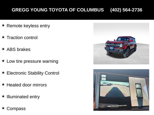 Enjoy Ford's fearless SUV with intelligent safety thanks to automatic braking, a rearview camera, trailer sway control, tire pressure monitoring, hill start assistance, and more. You can bet our Bronco Badlands is ready to ride with features like those! Save this Page and Call for Availability. We Know You Will Enjoy Your Gregg Young Toyota of Columbus Test Drive Towards Ownership!