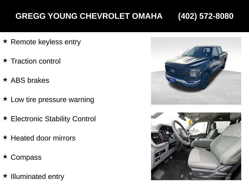 Why BUY from Gregg Young Chevy Omaha? When you choose this Agate Black 2023 Ford F-150 XLT with 72,507 miles, you are not just buying a used vehicle - you are investing in quality, reliability and peace of mind. Our clientele depend on us for Transparent Pricing, Convenience and, most importantly, Customer FIRST Service! All purchases include 5 year Complimentary Maintenance Package, valued at over $1,000! What this vehicle includes: Equipment Group 300A Standard Safety and Security Forward collision mitigation - Forward thinking. You look away for just a second and suddenly the vehicle in front of you has stopped. That's when the forward collision mitigation system comes to life. When it senses an impending impact, it will activate a combination of features to help prevent or reduce the severity of an accident. Forward collision mitigation is always looking ahead. Forward collision mitigation - Forward thinking. You look away for just a second and suddenly the vehicle in front of you has stopped. That's when the forward collision mitigation system comes to life. When it senses an impending impact, it will activate a combination of features to help prevent or reduce the severity of an accident. Forward collision mitigation is always looking ahead.Technology and Telematics Smart device mirroring - Smartphone, meet smart car. You can control your device through your vehicle's infotainment system. Smart device mirroring brings together safety and convenience by making it easier to find what you're looking for while keeping your eyes on the road. AppLink/Apple CarPlay and Android Auto smart device wireless mirroring AppLink/Apple CarPlay/Android Auto smart device wireless mirroring ENGINE: 5.0L V8, AGATE BLACK METALLIC When you choose a Certified Pre-Owned vehicle from Gregg Young, youre not just buying a used car youre getting extra protection, added peace of mind, and built-in value you wont find with an ordinary pre-owned vehicle. Every Certified Pre-Owned vehicle must pass an extensive 172-point inspection performed by trained technicians. From engine and transmission performance to interior quality, safety features, and road-test standards, we verify the vehicle meets strict certification requirements before it ever reaches our lot. Ask if this vehicle qualifies for our Certified Pre-Owned Program 12-Month / 12,000-Mile Premier Coverage Drive confidently from day one. Our Premier Warranty* protects you against unexpected repairs for your first 12 months or 12,000 miles. Whats covered? Practically all major vehicle components (excluding maintenance items and wear-and-tear parts) Electrical, mechanical, interior, exterior, and more giving you true peace of mind with your purchase. 36-Month / 100,000-Mile Powertrain Protection Our Certified Powertrain Warranty** keeps you covered long after you leave the dealership, protecting many of your vehicles most important and expensive components for up to 36 months or 100,000 miles. What's covered? Engine Parts Transmission/Transaxle Parts Drive Axle Parts Hybrid Components Transfer Case Components Come on in to Gregg Young Chevy Omaha today at 17750 Burt St Omaha NE 68118 or call (888) 617-6478 to schedule a test drive! What sets Gregg Young Chevrolet of Omaha apart? Family-run leadership Gregg Young and his children actively manage the dealership, blending experience with a personal touch. Community commitment supporting local charities and initiatives is at the heart of everything we do. Top-volume Chevrolet dealer one of the most trusted destinations for Chevrolet vehicles. Comprehensive vehicle care expert service, maintenance, and genuine parts keep your Chevrolet running at its best for years.