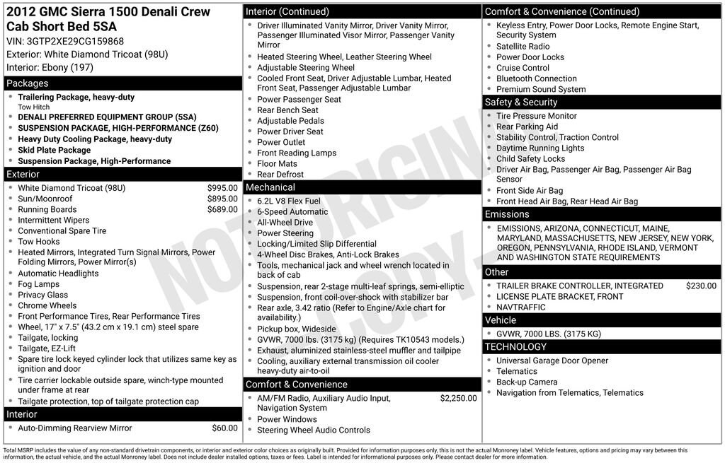 In stunning style and excellent capability, this **Accident Free**2012**GMC**Sierra 1500**Denali**Crew Cab**AWD**Heated and Cooled Leather Seats**Sunroof** is strutting its stuff in White Diamond Tricoat. Powered by a 6.2 Liter Vortec V8 generating 403hp while connected to the 6 Speed Automatic transmission. This All Wheel Drive combination supplies abundant power while earning nearly 18mpg on the highway.