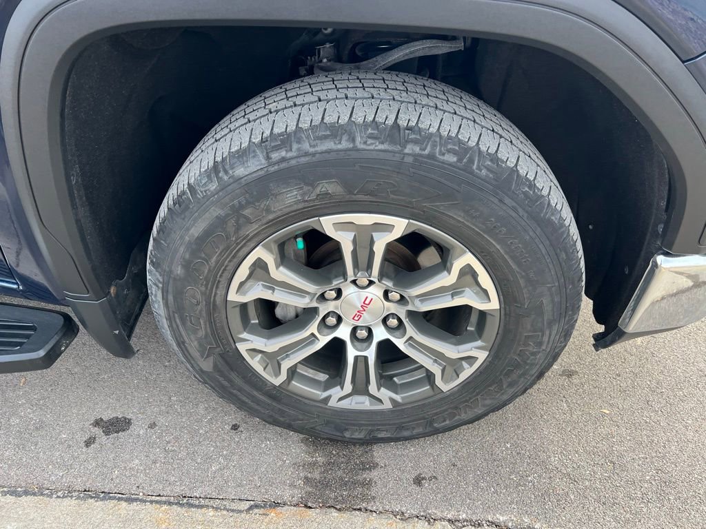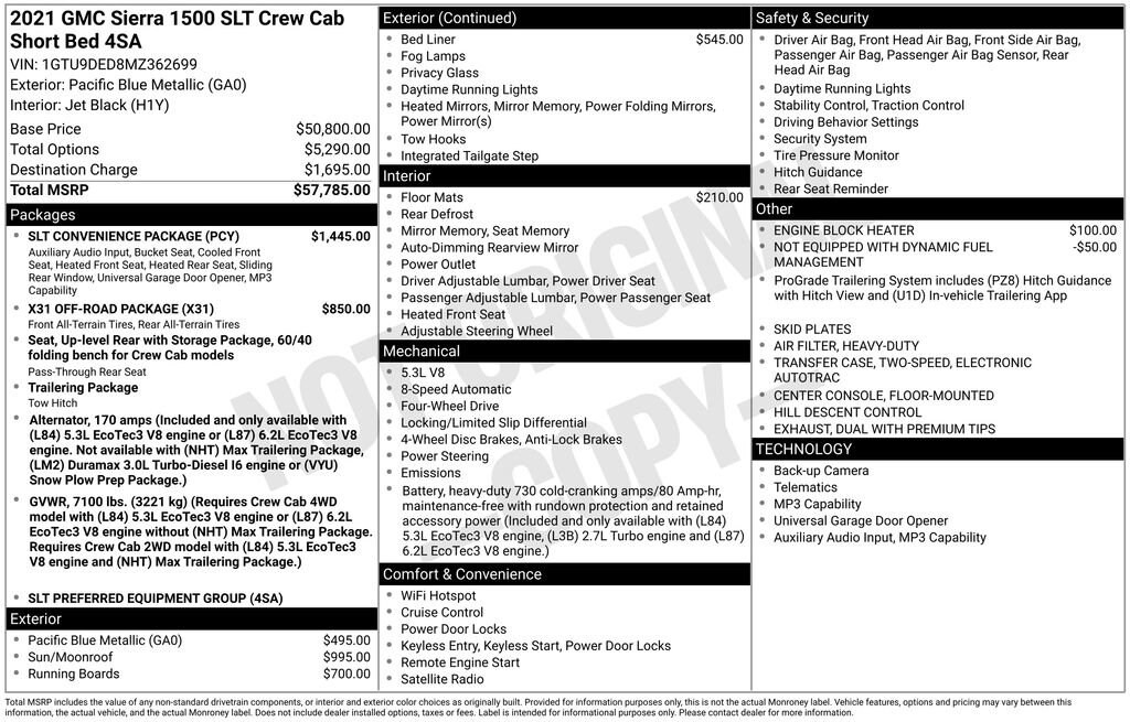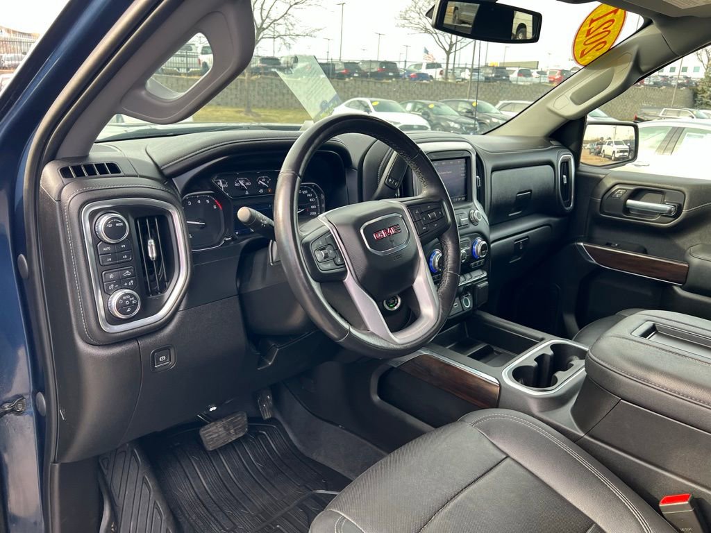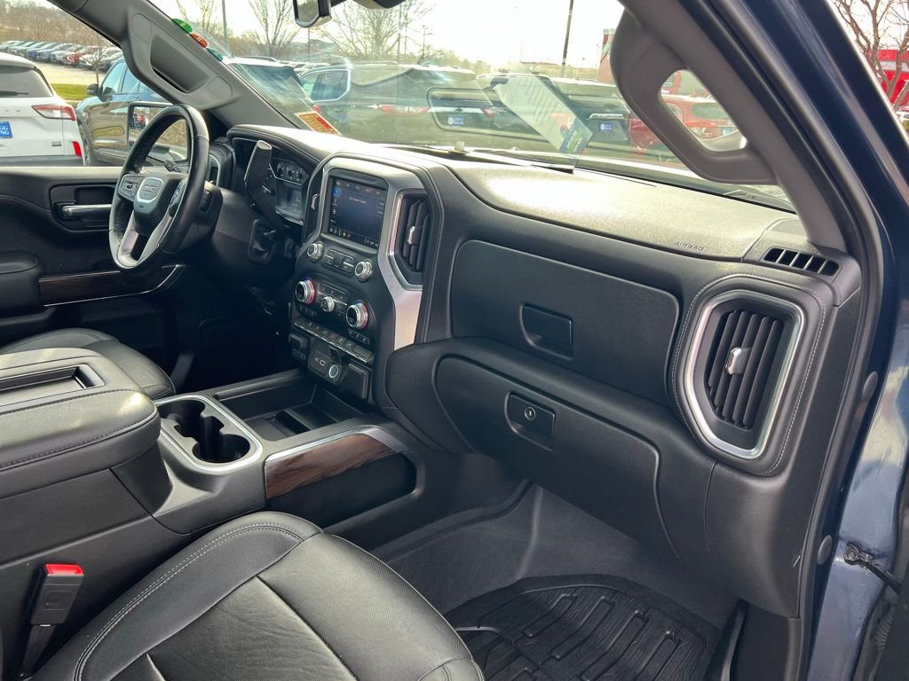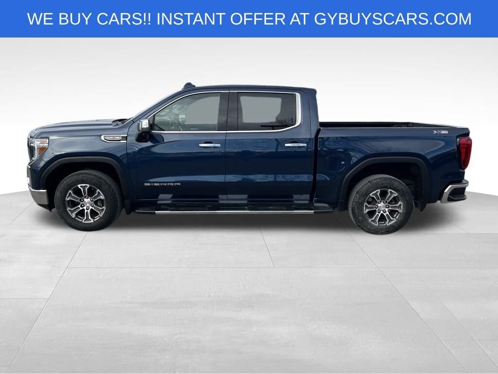 Powered by innovation, our **Accident Free**2021**GMC**Sierra 1500**SLT**Crew Cab**4X4**X31 Off-Road Package**Heated and Cooled Seats** delivers what you demand in a truck with a bold Pacific Blue Metallic design! Motivated by a 5.3 Liter EcoTec3 V8 offering 355hp to an 8 Speed Automatic transmission so you can tow and haul with ease. This Four Wheel Drive truck also rewards you with tough trail capability thanks to our package's off-road suspension, Rancho shocks, two-speed transfer case, and locking differential, and it can see nearly 20mpg on the highway. Chrome accents and bumpers bring out the stylish side of our Sierra, which is further enhanced by LED lighting, fog lamps, alloy wheels, a ProGrade Trailering System, and a MultiPro tailgate.