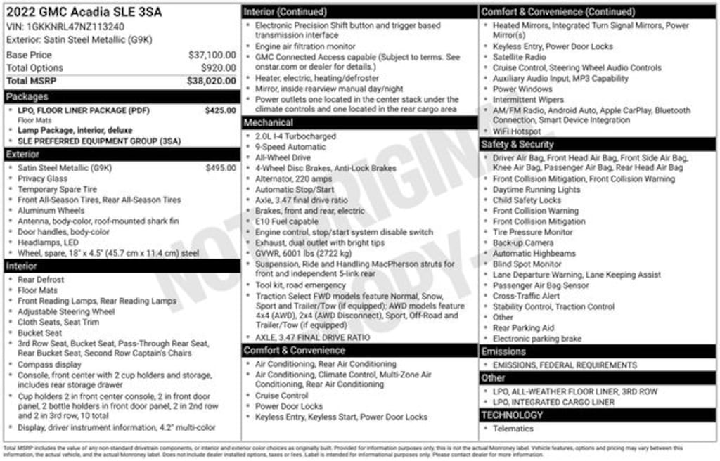 Striking in looks, our remarkable **One Owner**Accident Free**2022**GMC**Acadia**SLE**AWD**Apple CarPlay/Android Auto**Rear Camera** is ready for adventure in Satin Steel Metallic! Motivated by a TurboCharged 2.0 Liter 4 Cylinder providing 228hp matched to a 9 Speed Automatic transmission, so you're well-prepared for whatever comes next. This athletically engineered All Wheel Drive SUV also scores nearly 27mpg on the highway with rugged and refined good looks. You'll especially like our Acadia's signature LED lighting, dual exhaust outlets, alloy wheels, and heated power mirrors with built-in turn signals.
