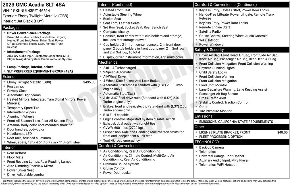 Our impressive **Certified**2023**GMC**Acadia**SLT**AWD**Navigation**Heated Leather Seats** combines precision engineering and premium features in Ebony Twilight Metallic! Motivated by a TurboCharged 2.0 Liter 4 Cylinder providing 228hp tethered to a 9 Speed Automatic transmission for family-friendly functionality. This All Wheel Drive SUV is also at your service with calm and composed handling, and it sees nearly 27mpg on the highway. Taut sheet metal enhances our Acadia's design with LED lighting, fog lamps, roof rails, a hands-free liftgate, dual exhaust outlets, alloy wheels, and heated power mirrors.