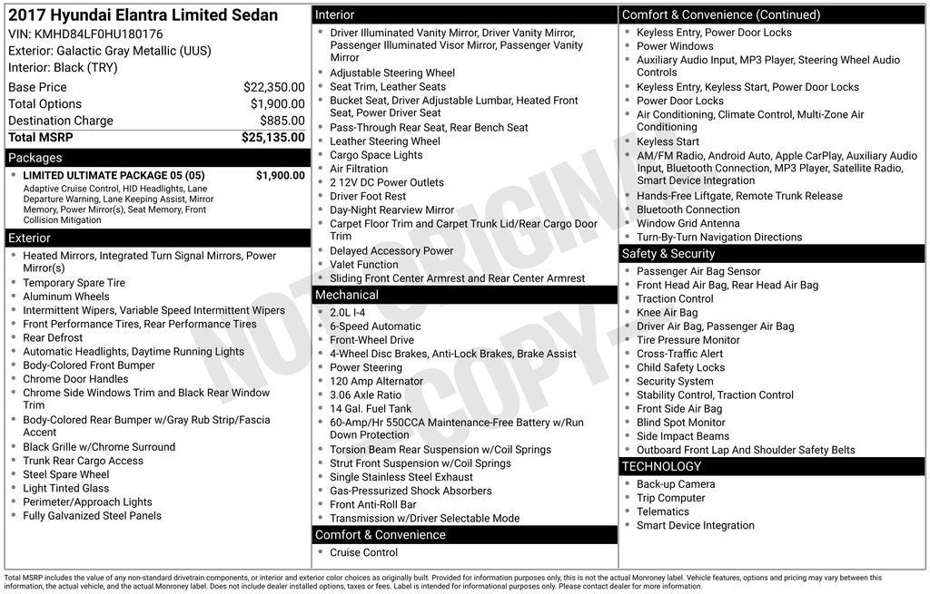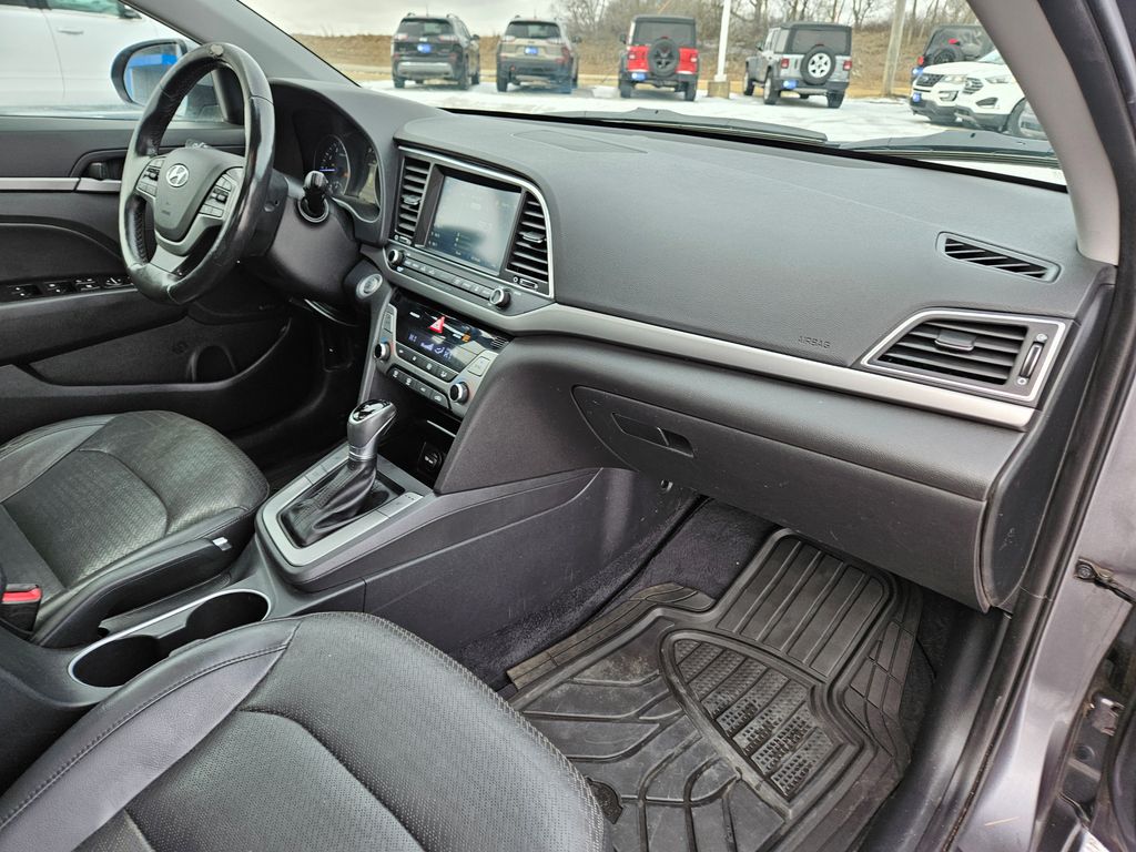 Transform your daily drive in our **2017**Hyundai**Elantra**Limited**Sedan**Sunroof**Heated Leather Seats** brought to you in outstanding Shale Gray Metallic! Powered by our 2.0 Liter 4 Cylinder that offers 147hp paired with a 6 Speed Automatic transmission with Shiftronic. An ideal balance of power and comfort, our Front Wheel Drive sedan helps you score nearly 38mpg on the highway and an exciting, agile driving experience on every commute. Sleeker and refined with alloy wheels, sunroof, LED daytime running lights, and a beautiful chrome grille, our Elantra Limited looks upscale and makes a great first impression.