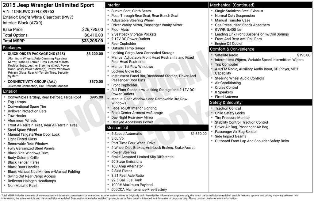 Our great looking **Accident Free**2015**Jeep**Wrangler Unlimited**Sport**4WD**Black 3-Piece Hard Top**Cloth Seats** shown in a Bright White Clearcoat can tackle any harsh terrain! Powered by a 3.6 Liter V6 that produces 285hp and almost as much torque combined with the rock-solid Dana axles while connected to a 5 Speed Automatic transmission. This Four Wheel Drive SUV will allow you to maintain civility or help you to carve your path where ever you see fit while offering nearly 21mpg on the highway. With city streets and freeways providing an increasingly unfriendly atmosphere to standard, car-based suspensions, large tires, and real ground clearance are increasingly handy for the committed urbanite.Enjoy the Sport's interior lighting, which makes it easier to climb in even on moonless nights. If you want an open-air cruise, remove the top, put on some shades, crank up the 6-speaker sound system, and hit the road, trail, beach, or mountaintop near you!A sturdy safety cage surrounds you in this Jeep, and multistage airbags, stability control, and Hill-start help you along the way. Our Wrangler Sport offers the legendary rock-climbing ability of America's favorite off-roader, with a dose of comfort to go along for the ride! Save this Page and Call for Availability. We Know You Will Enjoy Your Test Drive Toward Ownership!