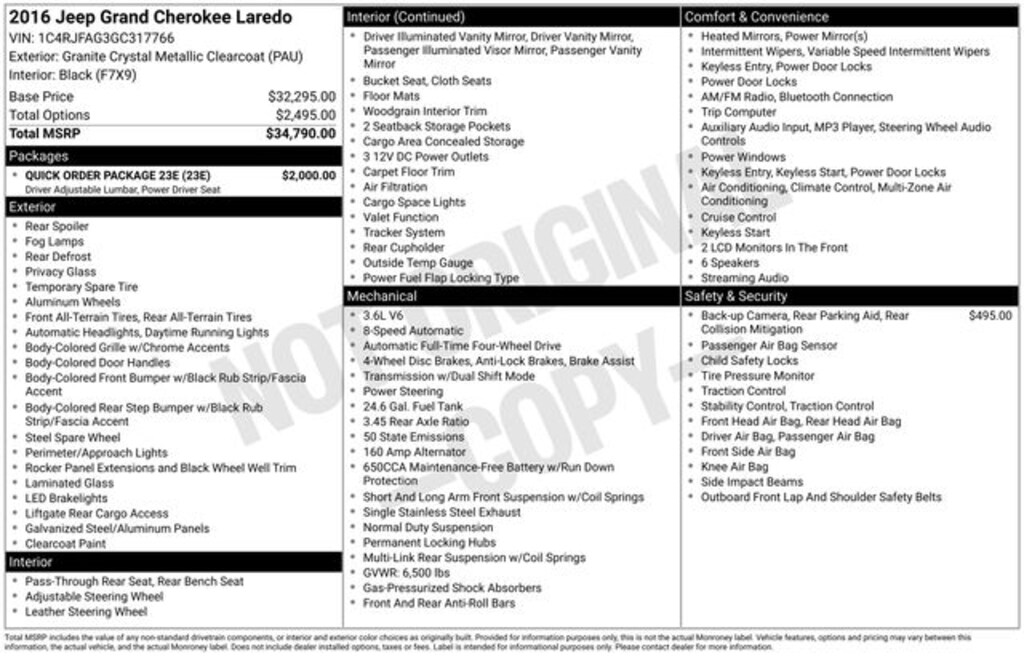 Our **Accident Free**2016**Jeep**Grand Cherokee**Laredo**4WD**Rear Camera**Bluetooth** in Bright Granite Crystal Metallic Clearcoat is an intelligent choice. Powered by a 3.6 Liter Pentastar V6 that features 295hp paired with a paddle-shifted 8 Speed Automatic transmission to provide a best-in-class highway driving range. This Four Wheel Drive SUV offers nearly 26mpg on the highway and cruises almost 600 miles on one tank, all while enjoying a smooth ride that will have you looking for the long way home. The premium good looks of our Grand Cherokee Laredo are enhanced by beautiful alloy wheels, a distinctive lower front and rear fascia, and a large, aerodynamic spoiler.