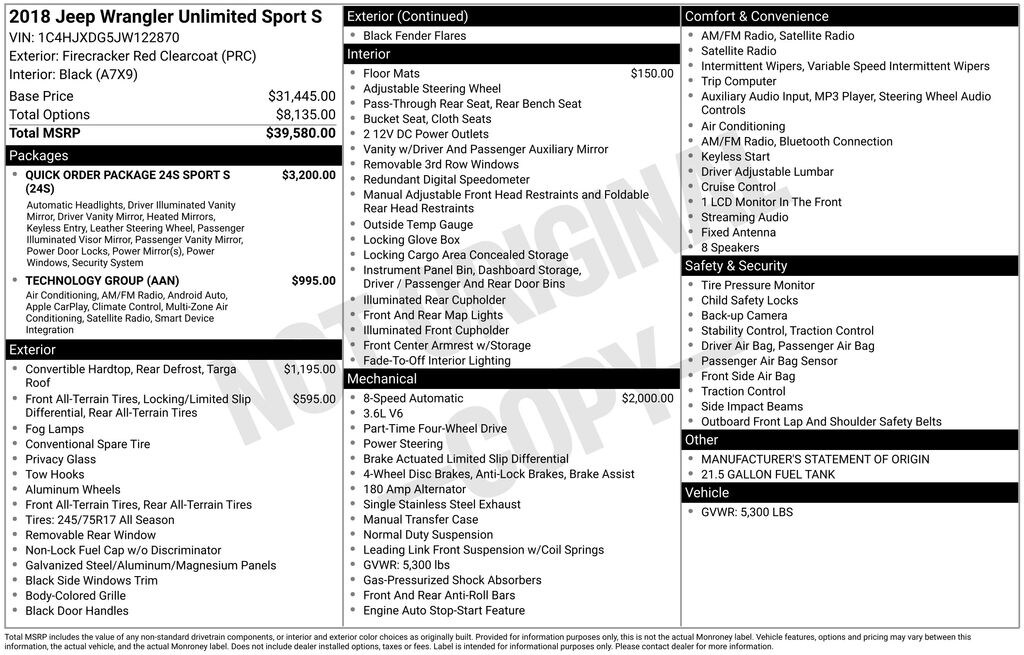 Turn heads at every corner in our spectacular 2018 Jeep Wrangler Sport S 4X4 presented in Firecracker Red! Powered by a 3.6 Liter V6 that produces 285hp paired with an 8 Speed Automatic transmission for quick acceleration! Our trail-rated tough Four Wheel Drive SUV offers legendary traction, ground clearance, and maneuverability, making your most adventurous dreams come true and yielding nearly 23mpg on the highway! Our Wrangler Sport S stands out from the crowd with distinct skid plates and aluminum wheels, embodying confident capability.