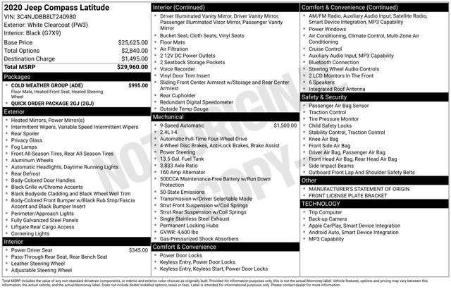 When adventure calls, our **2020**Jeep**Compass**Latitude**4X4**Bluetooth**Rear Camera** is ready to answer in White! Powered by a 2.4 Liter Tigershark 4 Cylinder that provides 180hp matched to a 9 Speed Automatic transmission for exploring the world on your own terms. Active Drive and Selec-Terrain help expand your boundaries, and this Four Wheel Drive SUV sees nearly 30mpg on the highway. Our Compass knows how to stand out in a crowd, too, with automatic quad halogen headlamps, fog lights, chrome accents, 17-inch alloy wheels, heated power mirrors, black roof rails, and matching cladding.