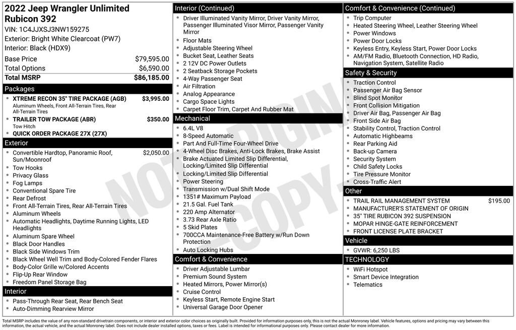 Ready to rumble, our **Accident Free**2022**Jeep**Wrangler Unlimited**Rubicon 392**4 Door**4X4**Trailer Tow Package**Navigation** puts incredible power on display in Bright White! Motivated by a 6.4 Liter V8 offering 470hp to a paddle-shifted 8 Speed Automatic that keeps 392 cubic inches of fury under your control. This Four Wheel Drive SUV also maintains iconic off-road capability and sees nearly 17mpg on the highway. Exclusive exterior cues like a functional hood scoop, 392 Rubicon graphics, beadlock-capable alloy wheels, LED lighting, fog lamps, and a three-piece removable hardtop give our Wrangler an unforgettable look.Our Rubicon 392 cabin deploys more unique touches, including heated black leather front seats with performance bolsters, embroidered logos, a heated sport-style steering wheel, automatic temperature control, and keyless access with pushbutton ignition for quick getaways. To dominate your digital world, the Uconnect® infotainment system has an 8.4-inch touchscreen, full-color navigation, WiFi compatibility, Android Auto®, Apple CarPlay®, Bluetooth®, voice command, and Alpine audio.Take intelligent Jeep safety systems with you as you explore, including automatic braking, a blind-spot monitor, adaptive cruise control, hill-start assist, tire-pressure monitoring, and more. Our Wrangler Rubicon 392 inspires you to roam further! Save this Page and Call for Availability. We Know You Will Enjoy Your Test Drive Towards Ownership! We offer PRE-APPROVAL programs so call (515) 256-4010 to get started today! At Gregg Young Chevrolet... We'll Go The Extra Mile For You. We have an app for that! Download the Gregg Young Chevrolet application directly to your iPhone or Android.